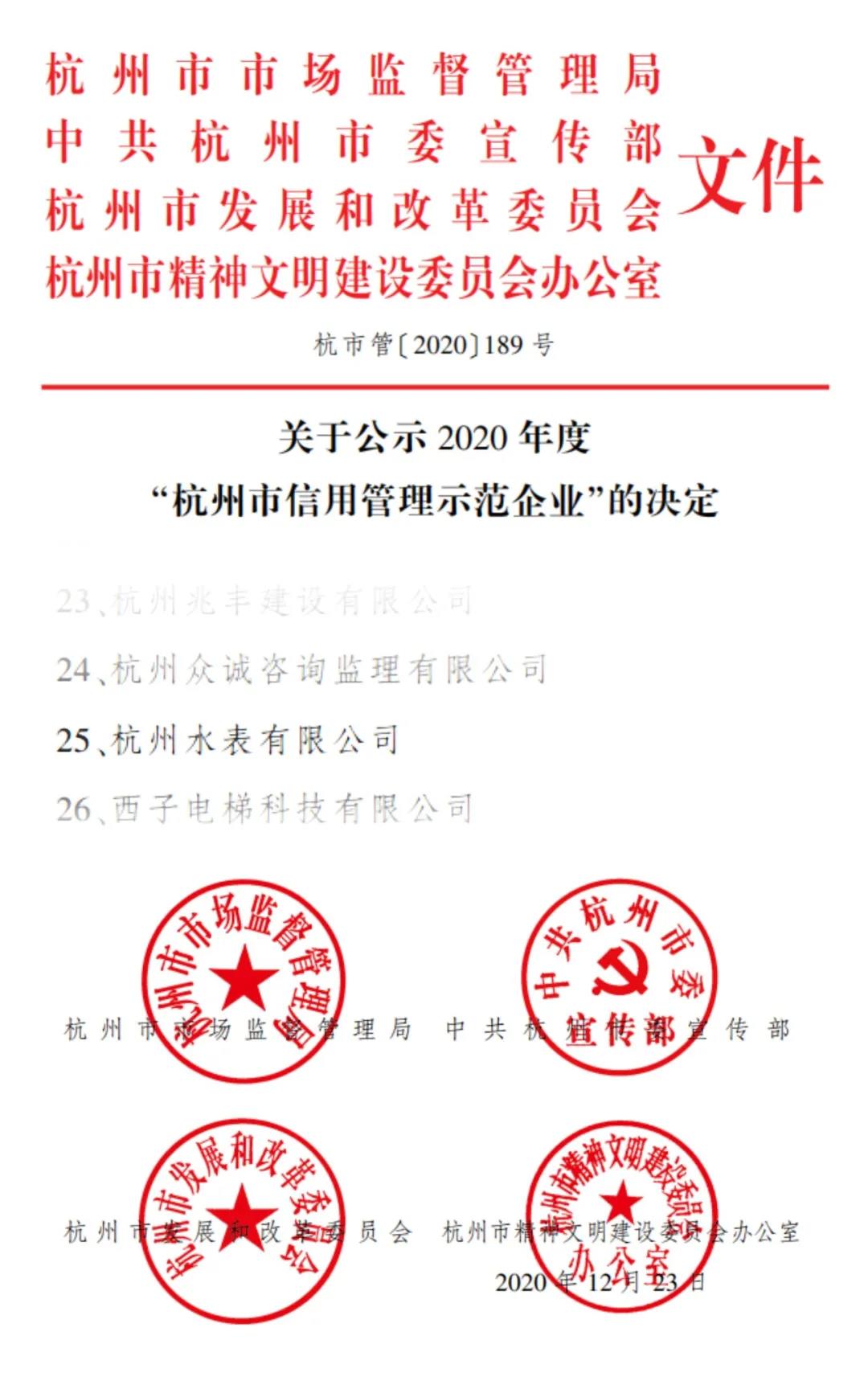 2020年12月23日,中共杭州市委宣传部、杭州市发展和改革委员会、杭州市精神文明建设委员会办公室、杭州市市场监督管理局四部门联合发文,正式公布《关于公示2020年度“杭州市信用管理企业”的决定》文件,向社会公示2020年度“杭州市信用管理企业”企业名单,公司凭借多年诚信经营的良好信誉度,荣列其中。
