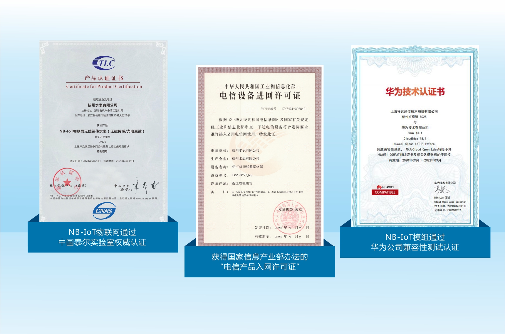 NB-IoT物联网水表先后获得中国泰尔实验室、华为公司兼容性及国家信息产业部颁发的“电信产品入网许可证”等权威认证,产品性能优势得到充分验证。
